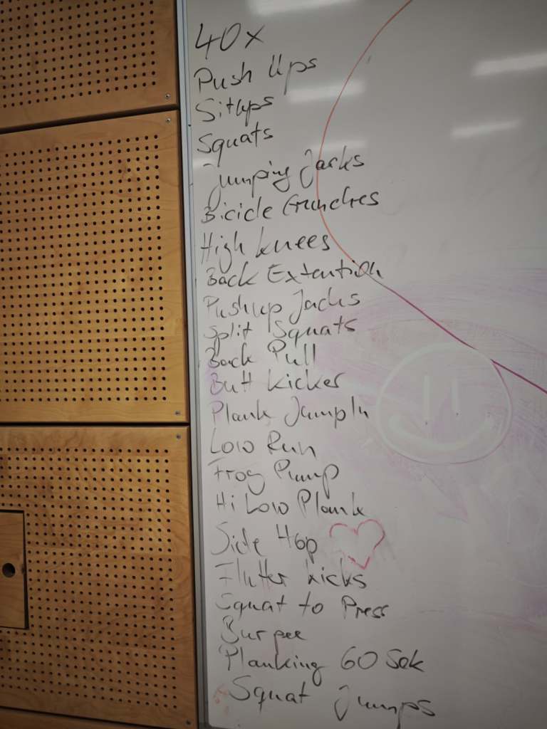 Die Trainingseinheiten bestanden aus kraft- und ausdauerlastigen Übungen, wie z.B. Kniebeuge, Liegestütze, Burpees und vieles mehr.